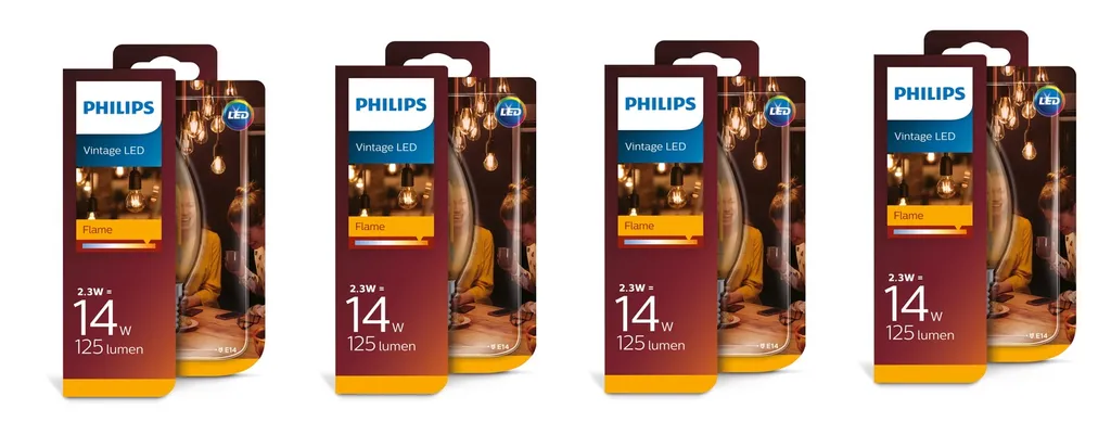 4 X Philips Vintage LED Kerze Flame 2,3W=14W 125lm A+ E14 2000K 15000hrs.