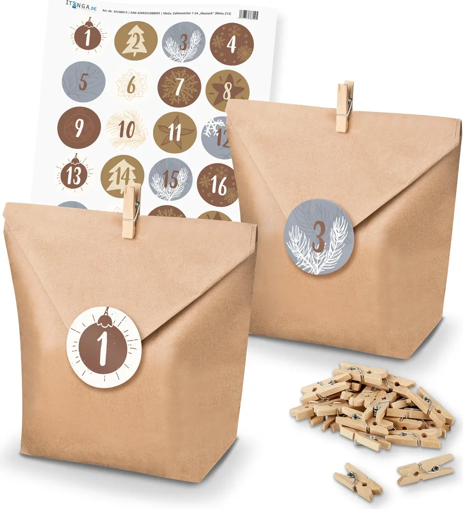 Adventskalender Set 15 Geschenktüten + Klammern + Sticker