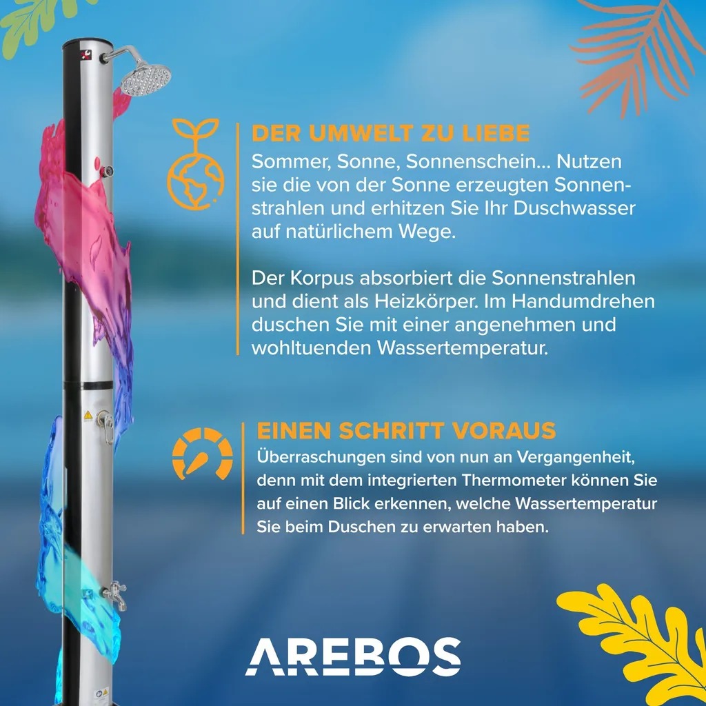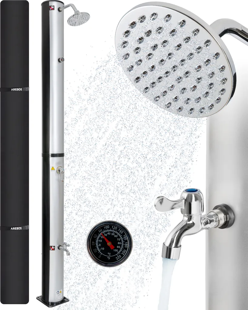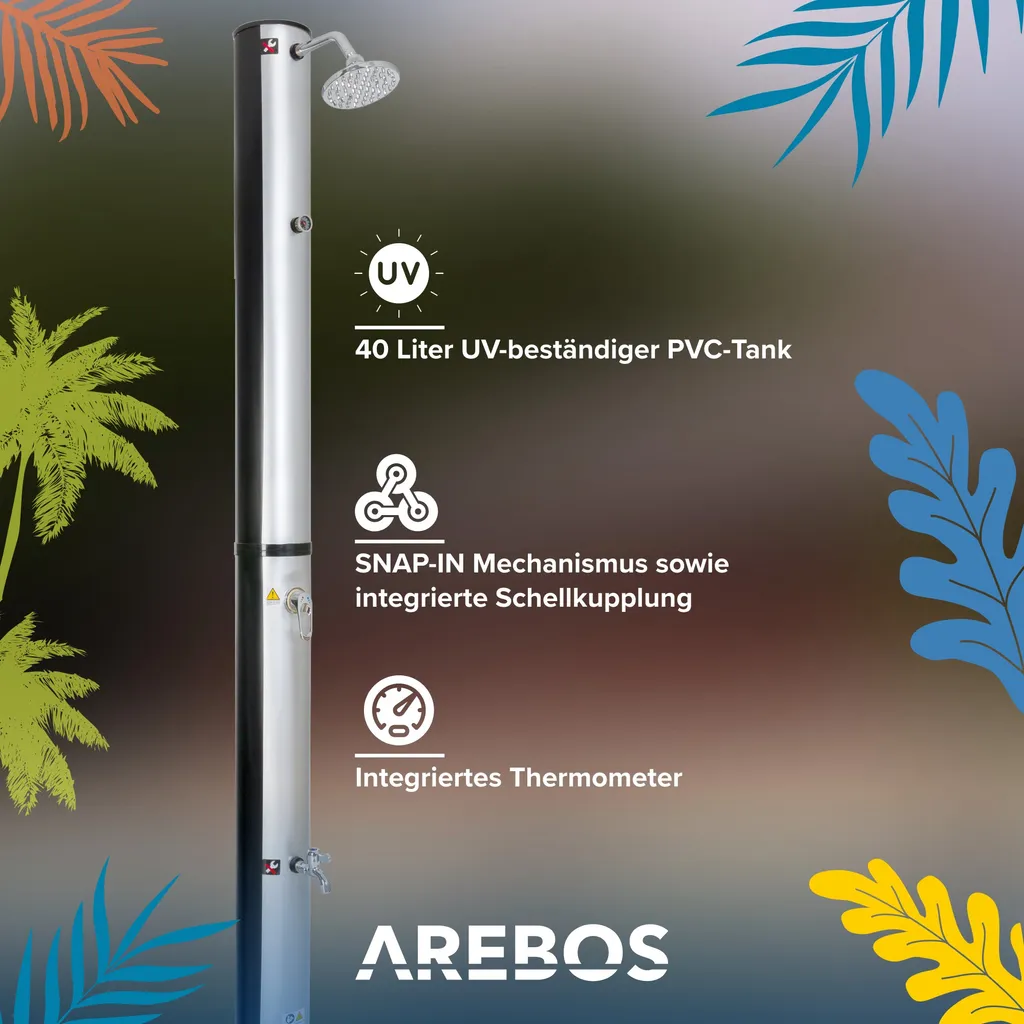 AREBOS Solardusche 40 Liter, Inklusive Abdeckhaube, Mit Integriertem Thermometer, Mit FuĂdusche, Mit Gartenschlauch-Anschluss, Silber-Schwarz