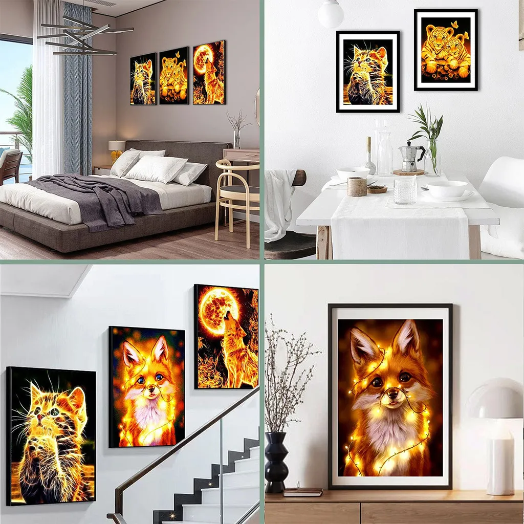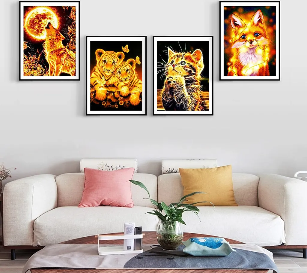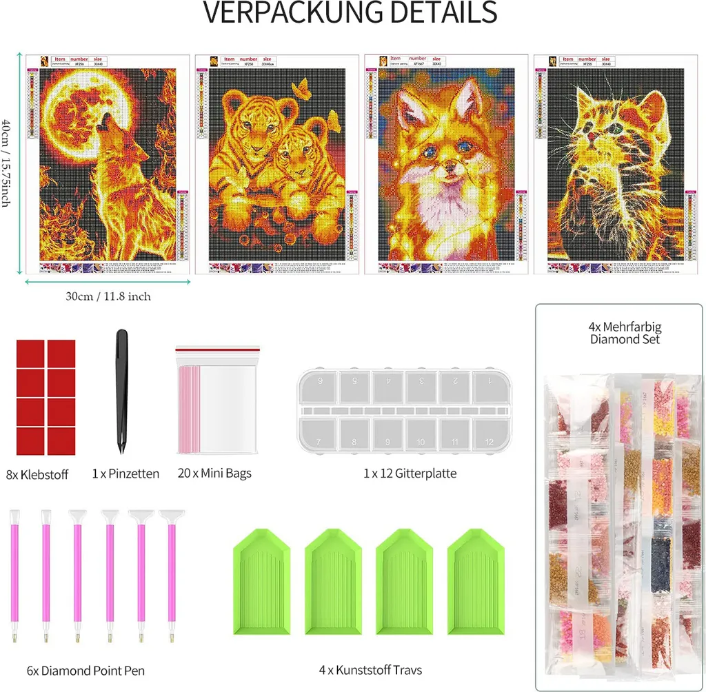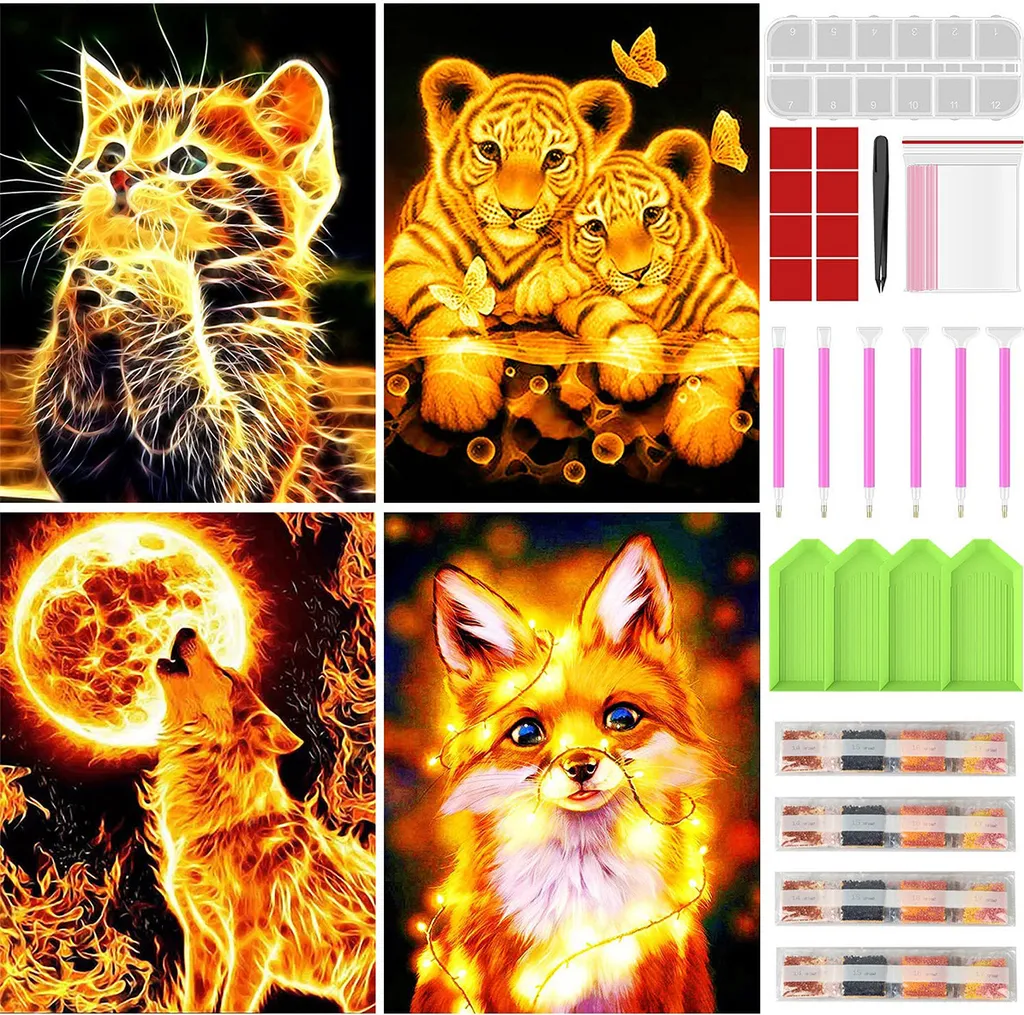 Diamond Painting Set, 4er Tiere Diamond Painting Katze Tiger Fuchs Wolf Bilder Mit Diamond Painting Zubehör (30x40cm)