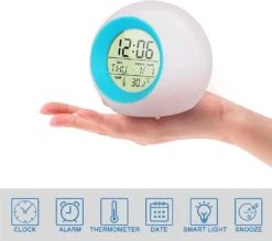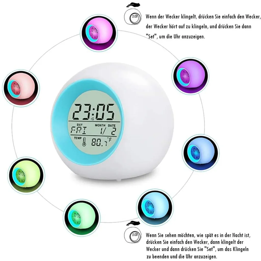 | Zusätzliche Varianten | Digitaler Wecker Kinder, LED Kinderwecker 7 Farben Nachtlicht Lichtwecker Schlummerfunktion für Mädchen Jungen, LED Kinderwecker, 12/24 Stunden Digitaluhr Licht, 7 Wecker Klingeltöne, Lichtwecker mit Datum und Temperatur, Wake Up Licht |