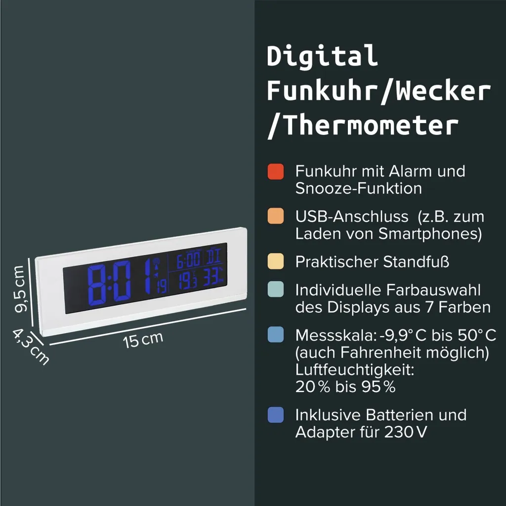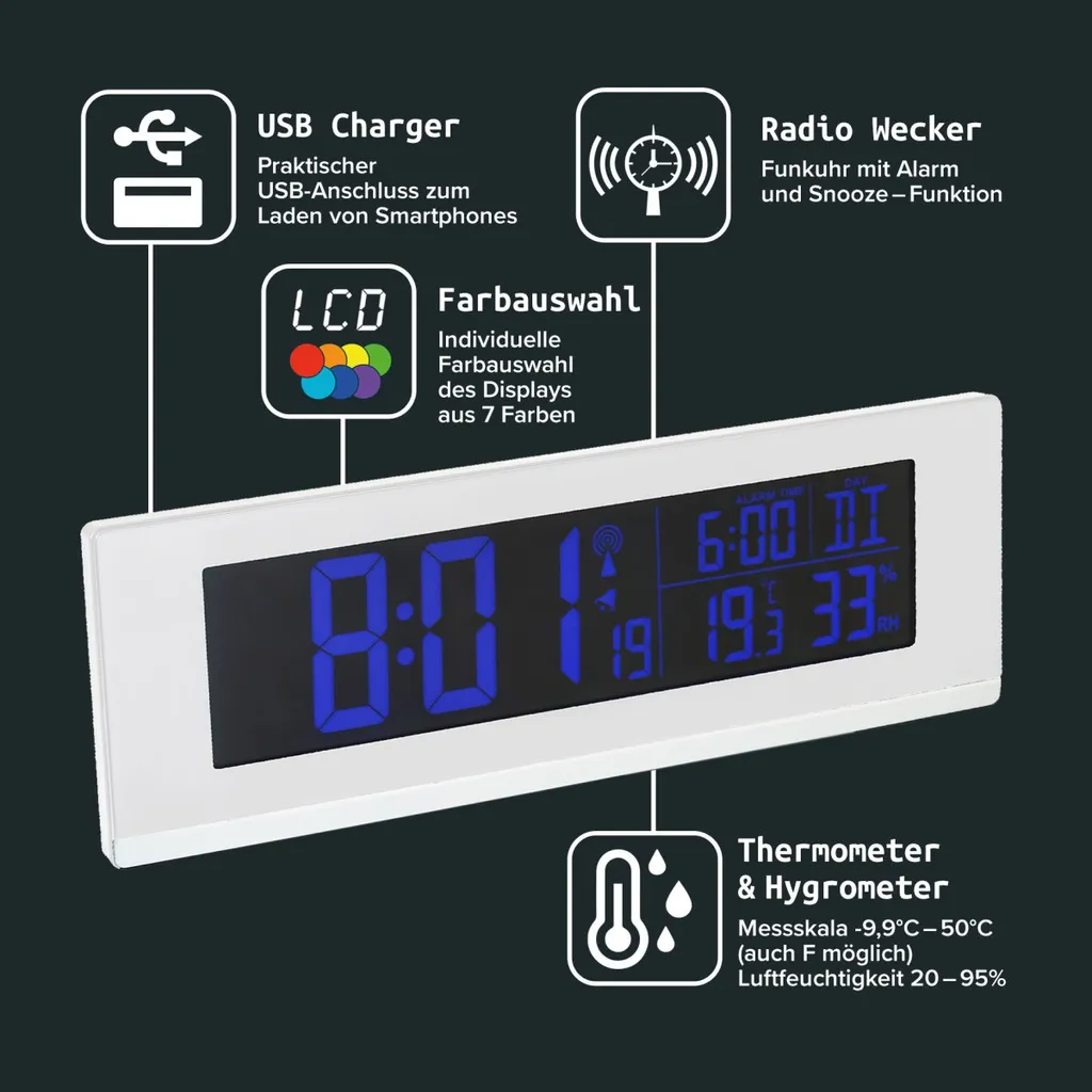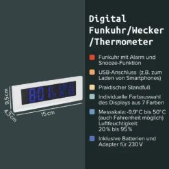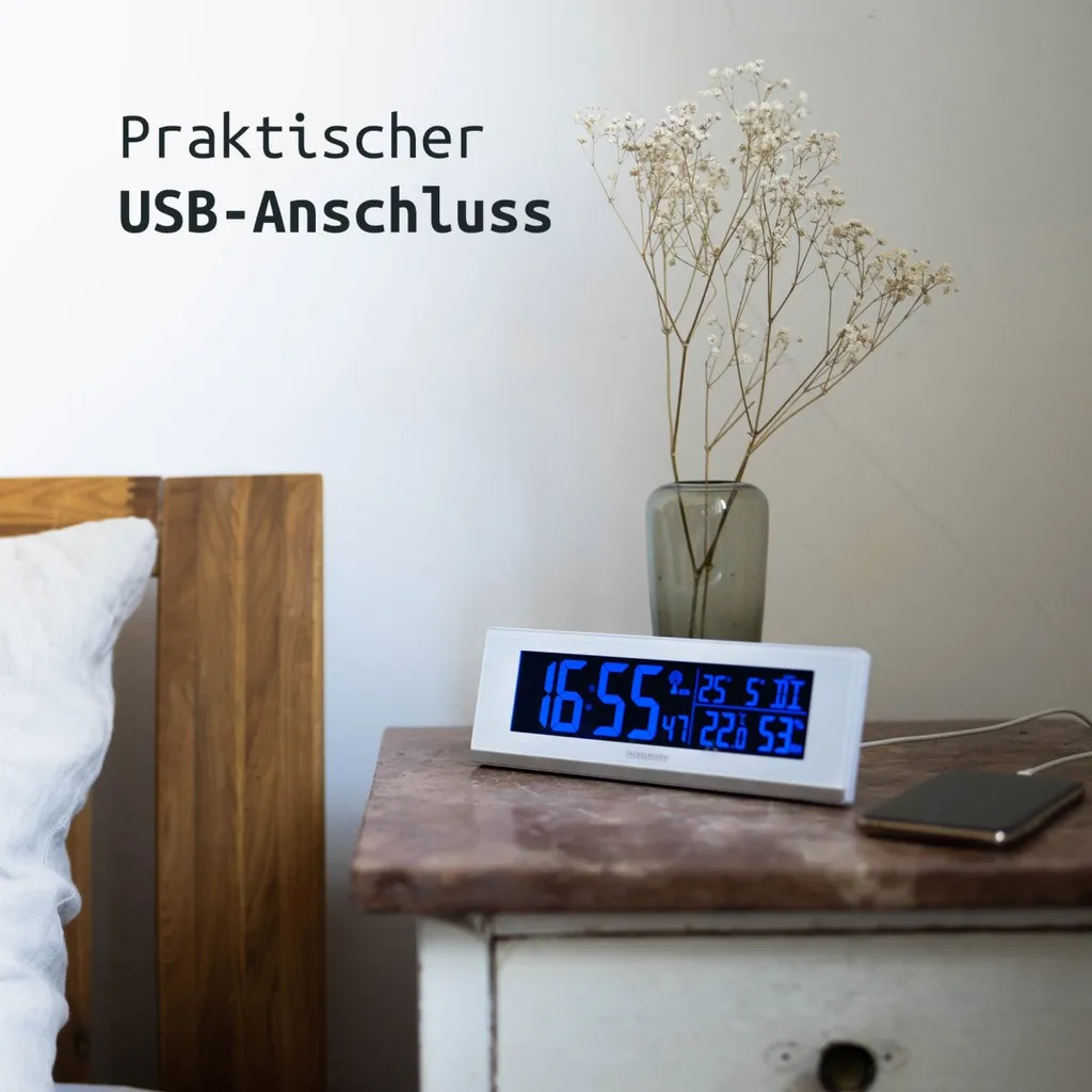 Fackelmann Digitale Funkuhr Mit Wecker Tecno, Digitaluhr Mit Temperaturanzeige, Funkwecker Mit USB-Anschluss, Hochwertiger Digitalwecker, Uhr Mit Thermo-Hygrometer (Farbe: Weiß)
