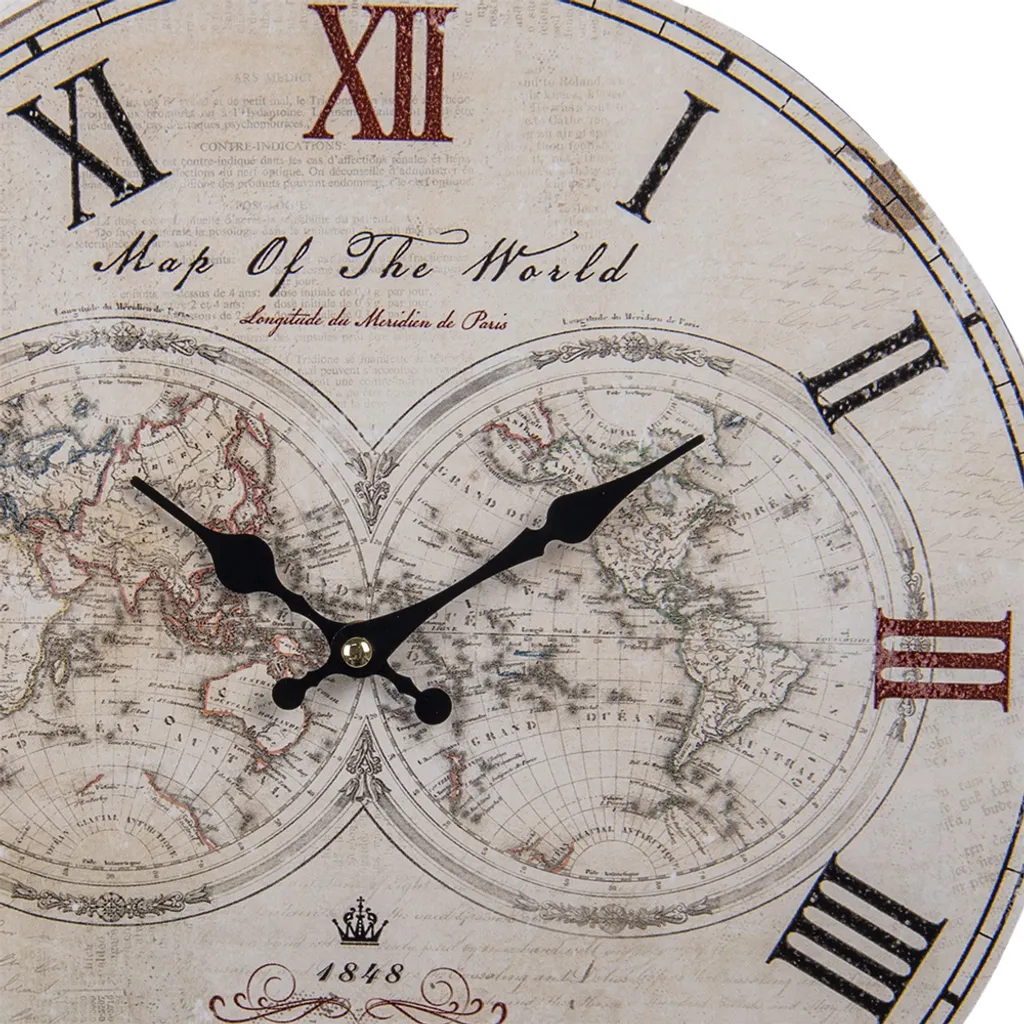 HAES DECO – Wanduhr 34 Cm Vintage Mit Weltkarte – Zifferblatt Römischen Ziffern