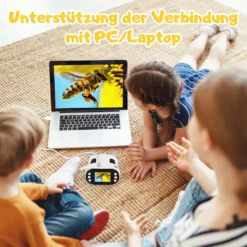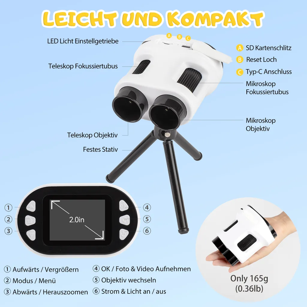 Mikroskop Kinder Mit Teleskop, Fernglas Kinder Kamera 1080P 8X Digitaler Zoom 2″ LCD Bildschirm Kompatibel Windows Mac PC Digital Mikroskop Science Kit Für Anfänger Kinder 6 8 10 Jahre (Weiß)