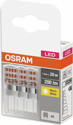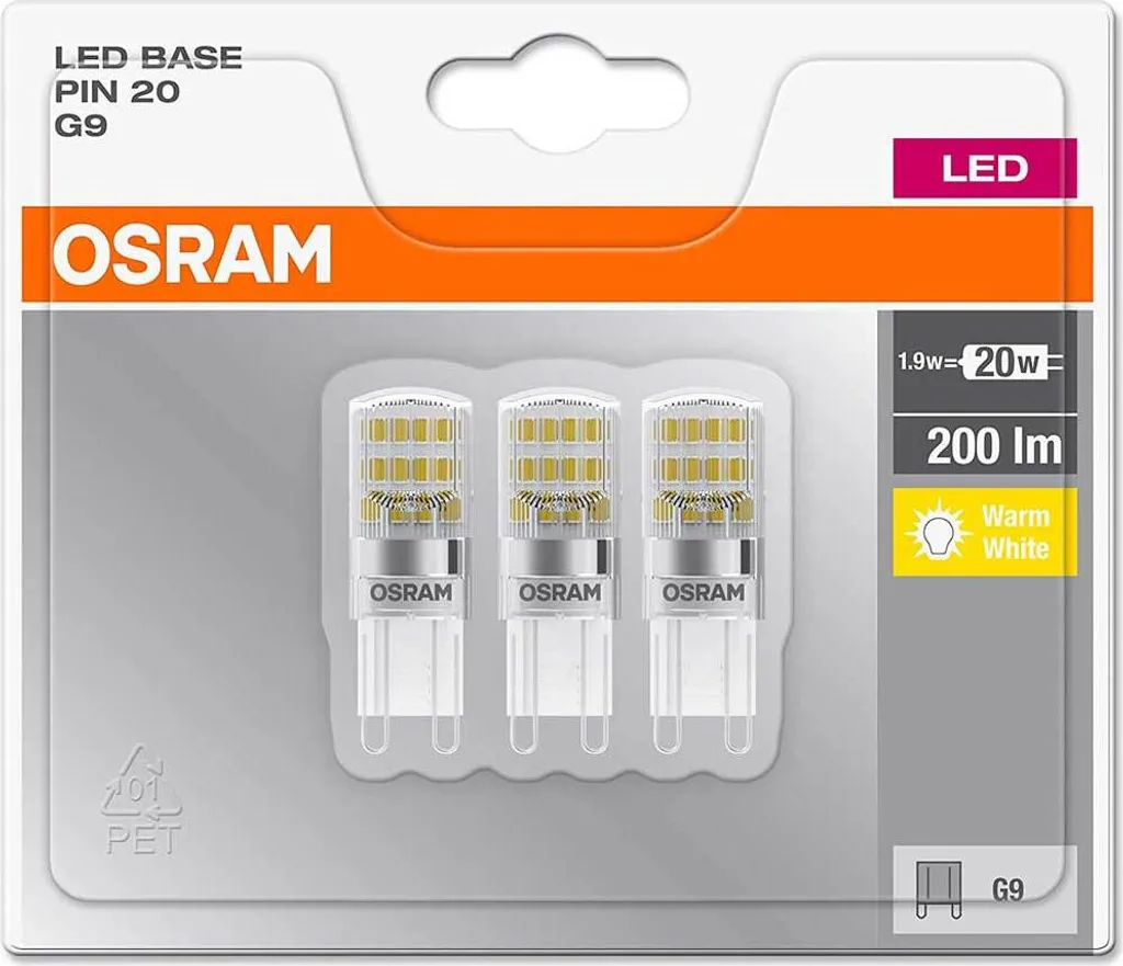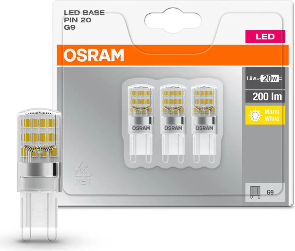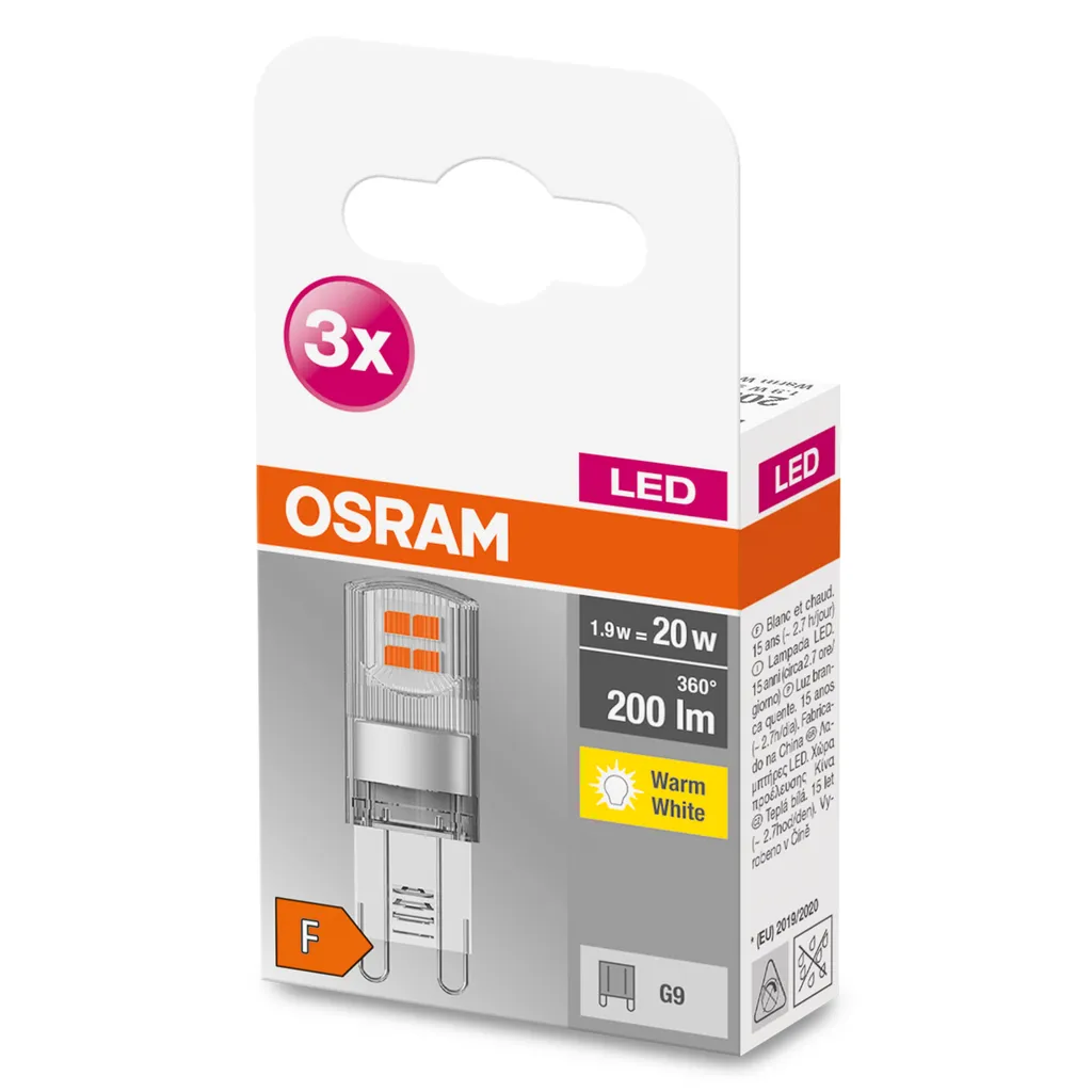 OSRAM BASE LED Lampe PIN, Pinlampe Mit G9 Sockel, 1,90W, Ersatz Für 20W-Glühbirne, Klar, Warmweiss (2700K), 3er-Pack
