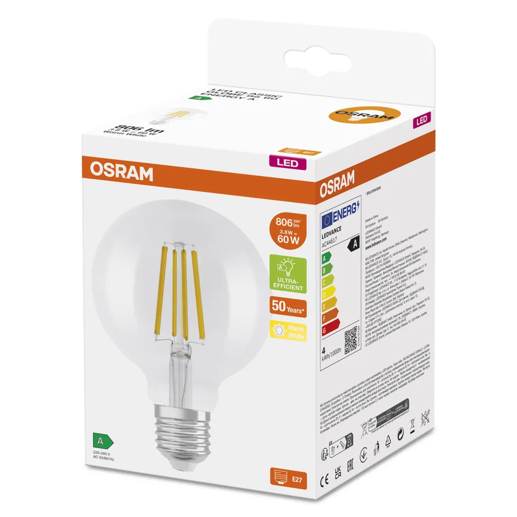 Osram LED Lampe Ersetzt 60W E27 Globe – G95 In Transparent 4W 840lm 3000K 1er Pack