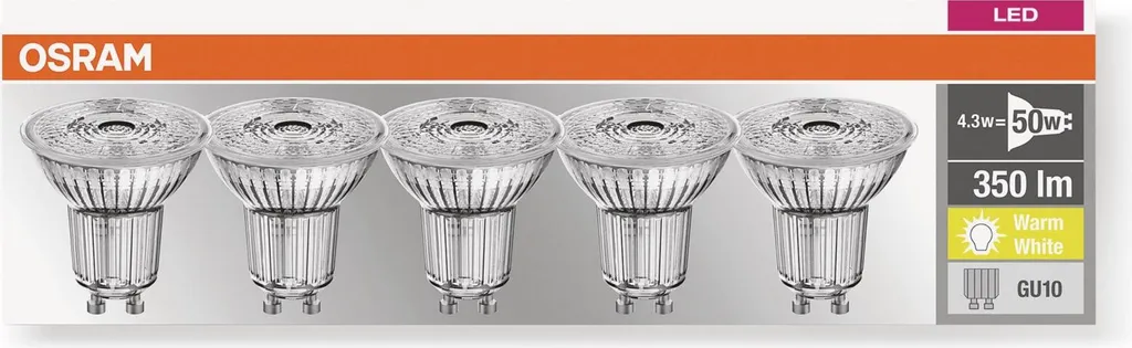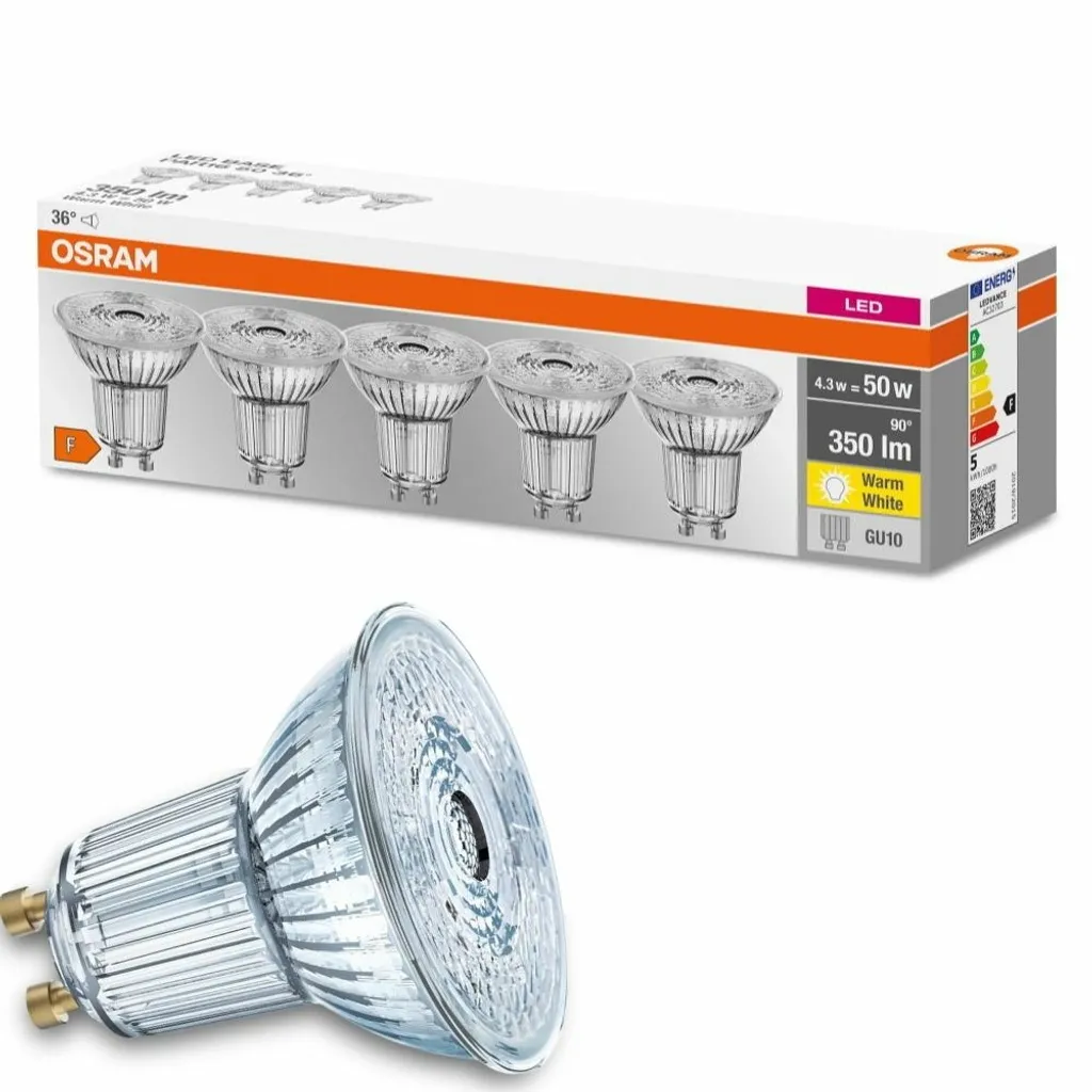 Osram LED-Lampe LED BASE PAR16, GU10, EEK F, 4,3 W, 350 Lm, 2700 K, 5 Stk.