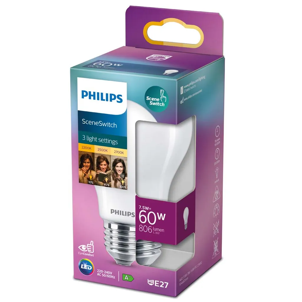 Philips LED SceneSwitch Lampe Ersetzt 60W, E27 Standardform A60, Matt, Dimmen Ohne Dimmer, 1er Pack